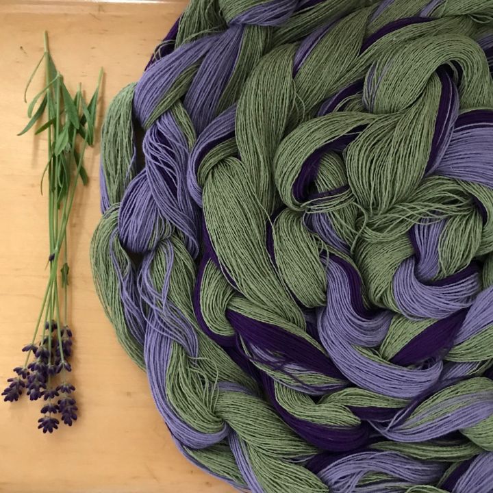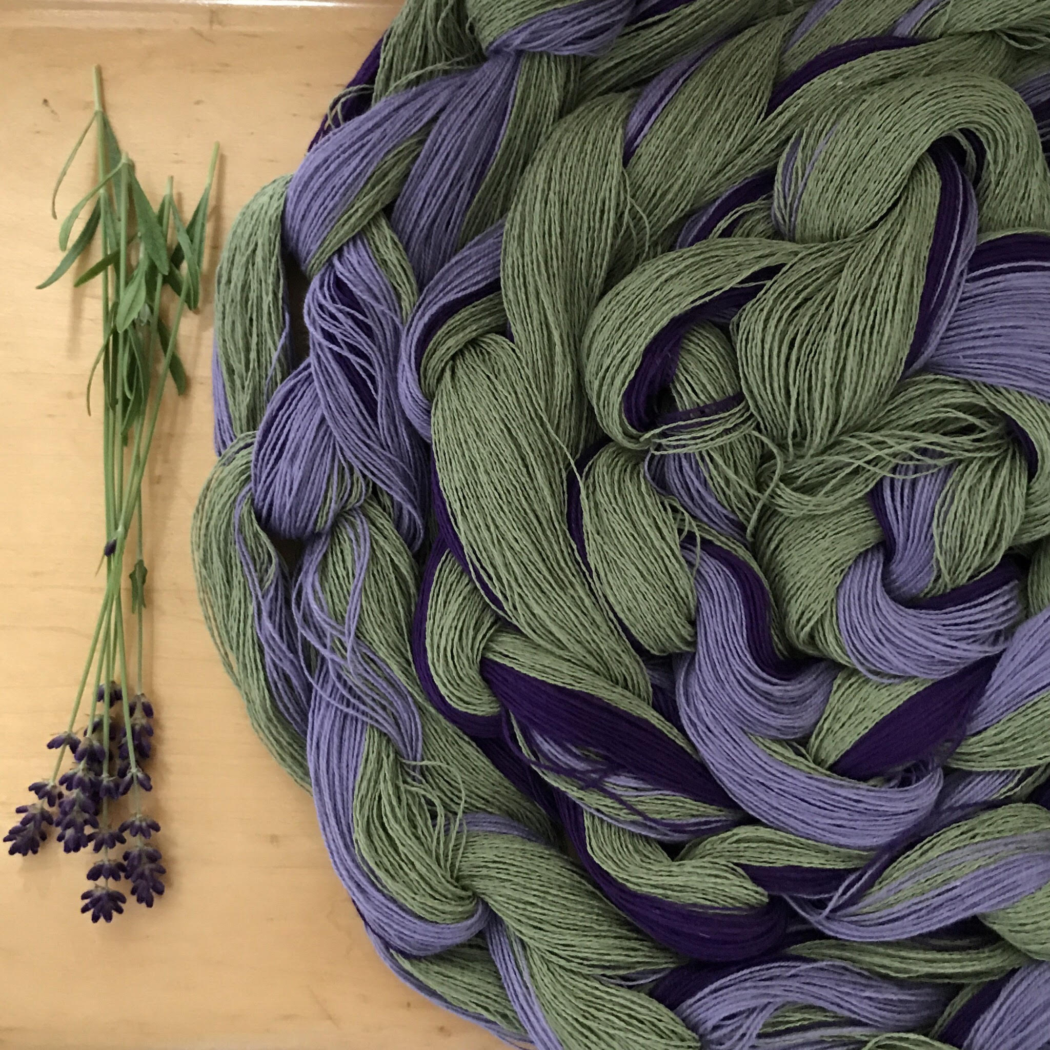 Lavender warp chain, destined for the loom.