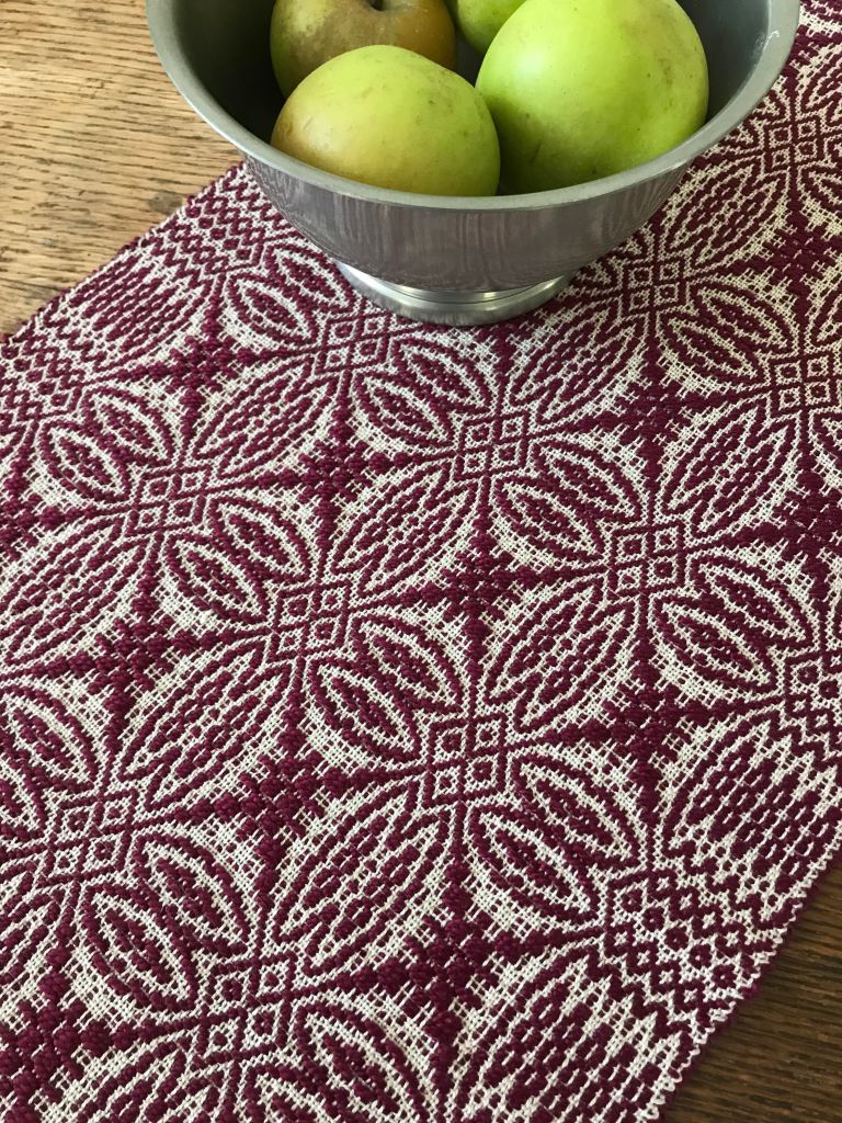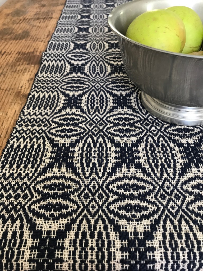 Since my return to Harrisvile, NH, I have resumed weaving that can best be accomplished on my floor loom. While I’m a fan of the rigid heddle loom for many reasons, weaving overshot on it is just not realistic (for me, anyway). I did a series of table runners that feature the traditional motif of “double orange peel” in navy blue and burgundy. The navy blue has a rich look to it, at least to my eye: