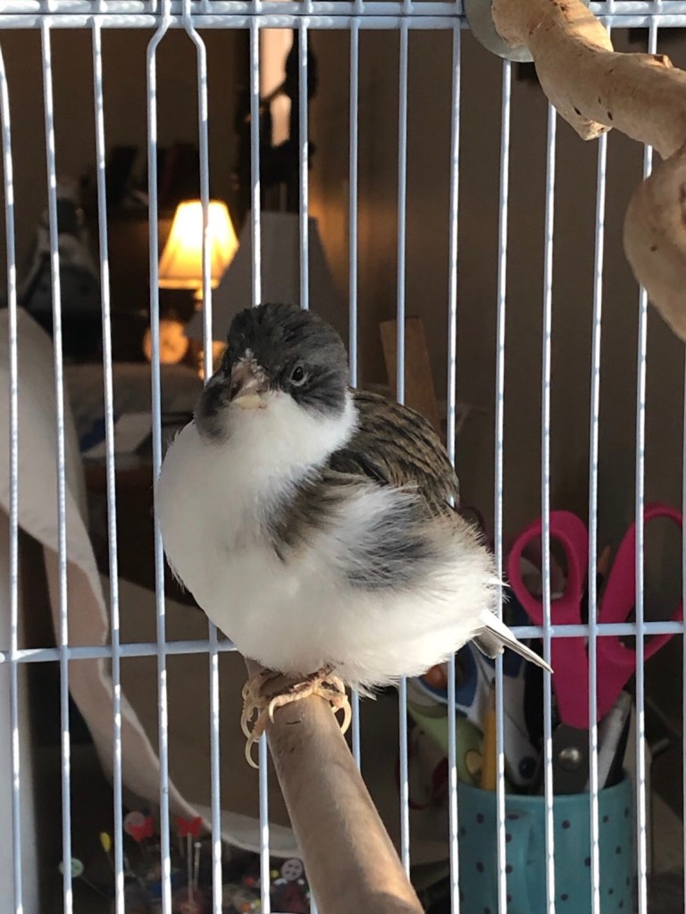 You can see that my ironing board serves as 1) ironing board 2) to-be hemmed inventory storage and 3) labeling and shipping station. The 4’ plastic folding table has my sewing machine, cutting mat, and various odds and ends (twill tape, pin cushions, grosgrain ribbon stash, etc…). And then there is my 8 shaft floor loom and bench. It is very cozy. It gets even cozier when Mr Darcy, my Scottish Fife canary hangs out with me.