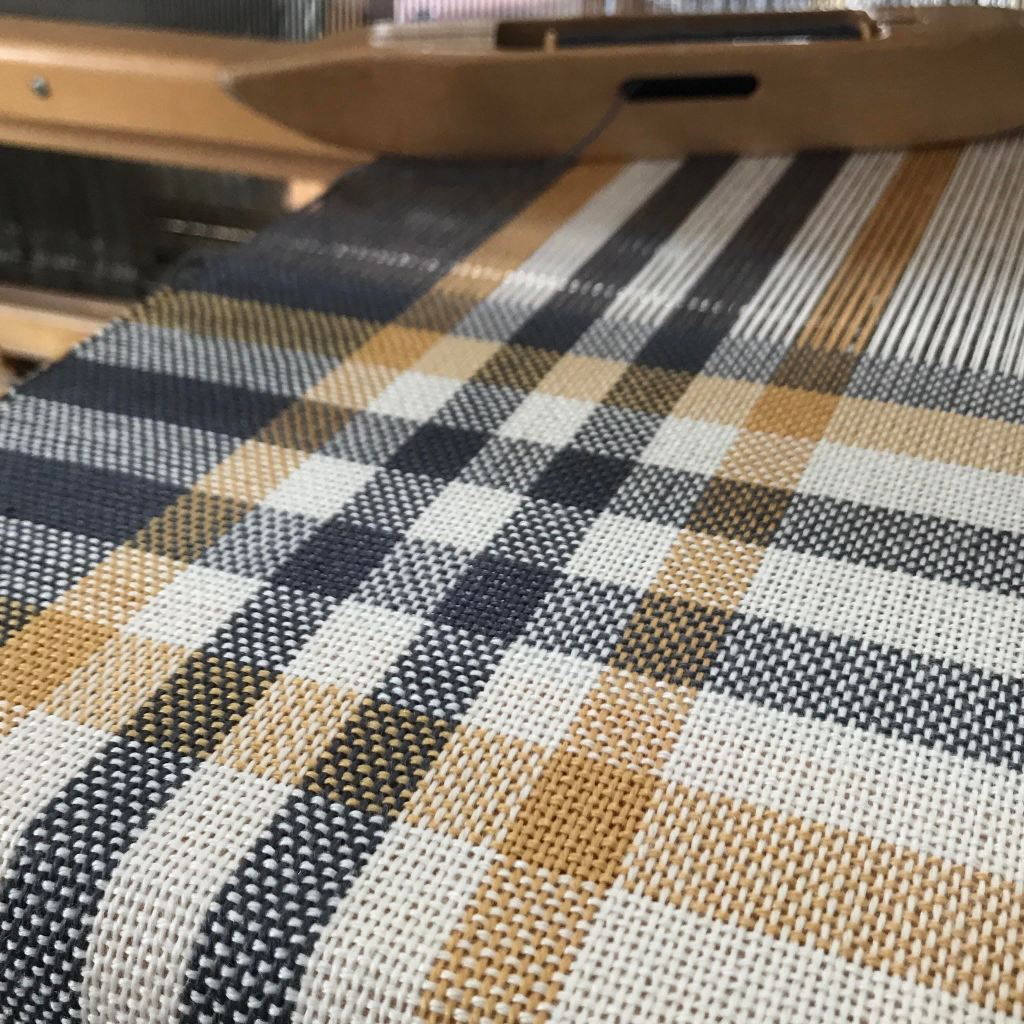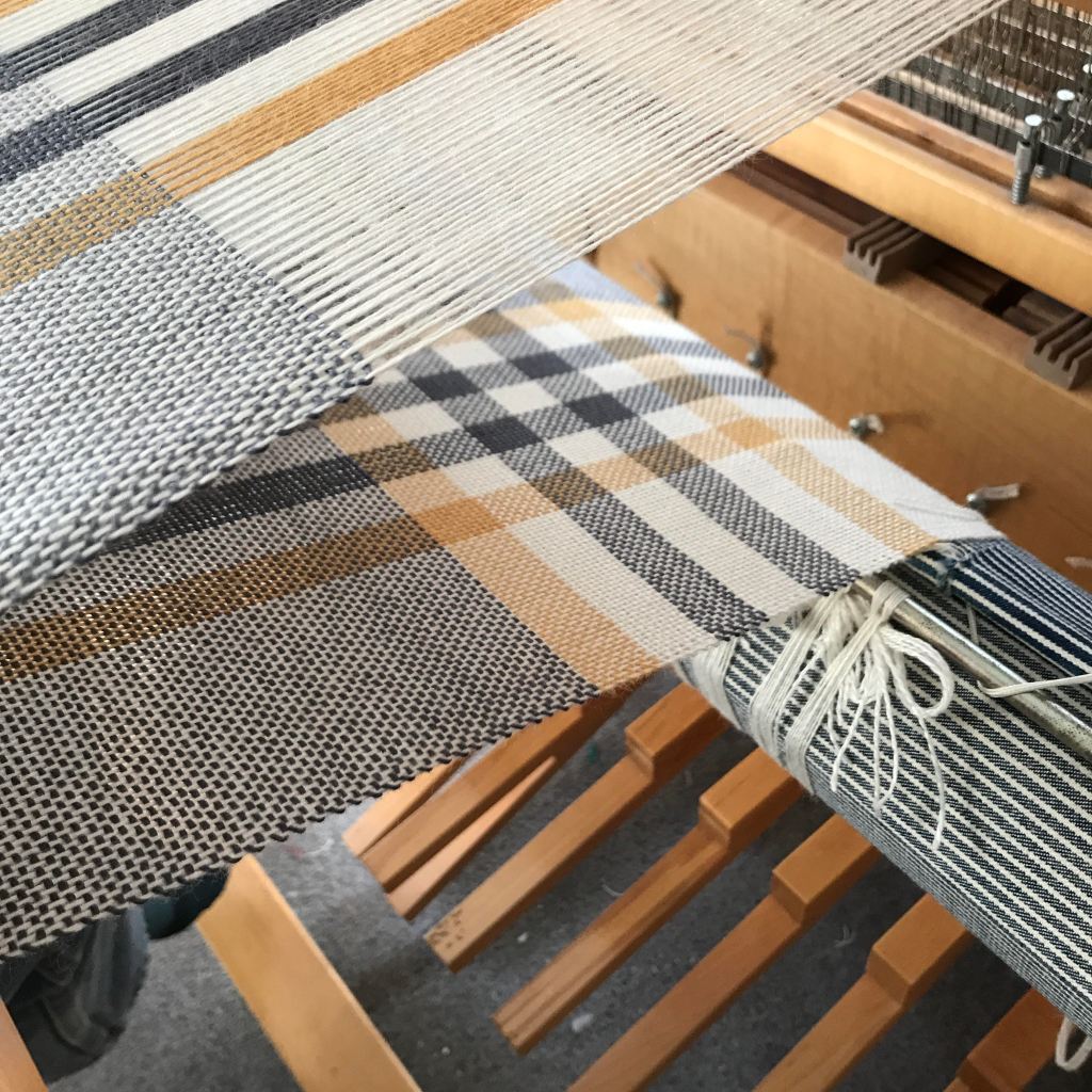 I’d like to see how these finish up before venturing into too many more variations of this design. Also, I have placemats to weave! I have a very long warp of black and ivory cottons to weave up into some log cabin placemats for two customers. And I’m all out of blue/ivory again so I plan to work those into the queue somehow.