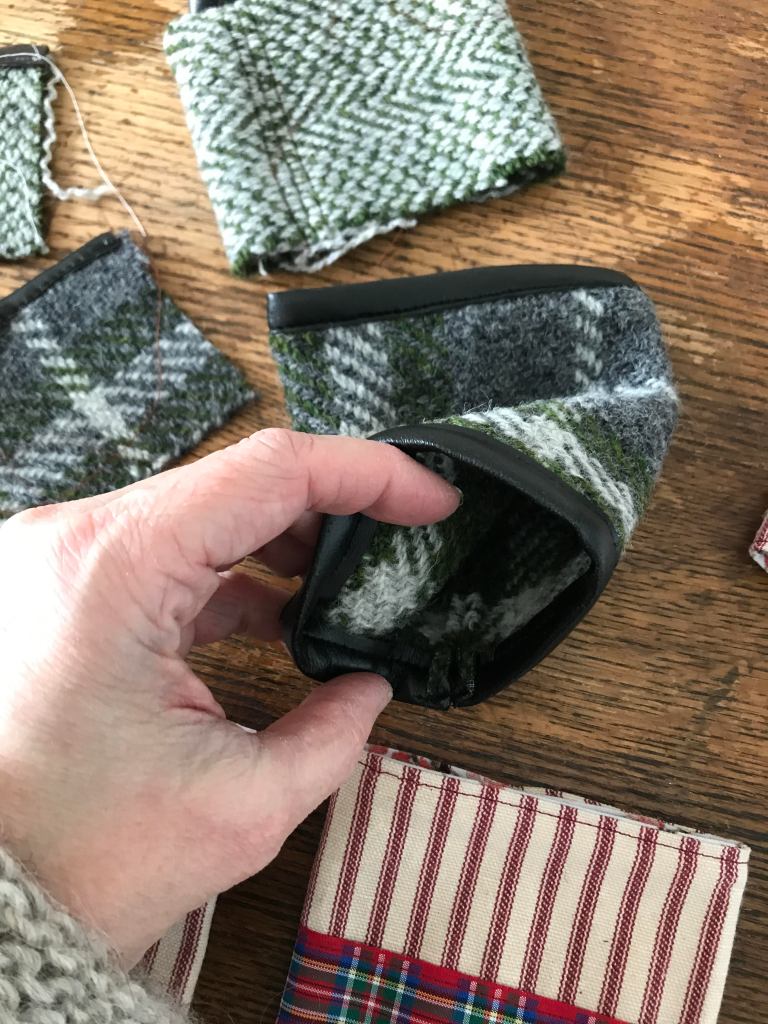 Sometimes one does not have an excess of handwoven fabric hanging around to make, say, a big cushion cover or handbag, but this Christmas I did use some of my handwoven wool to make flask covers for my sons and husband. (Here is the post where I showed pictures of these). I liked the concept a lot and have been mulling it over since December. There were things about my first few flask covers that I wanted to improve (i.e. avoid fake leather). So below, you can see some pictures I took of the samples and techniques that sometimes worked (and mostly didn’t!) as I tried to make an improved flask cover: