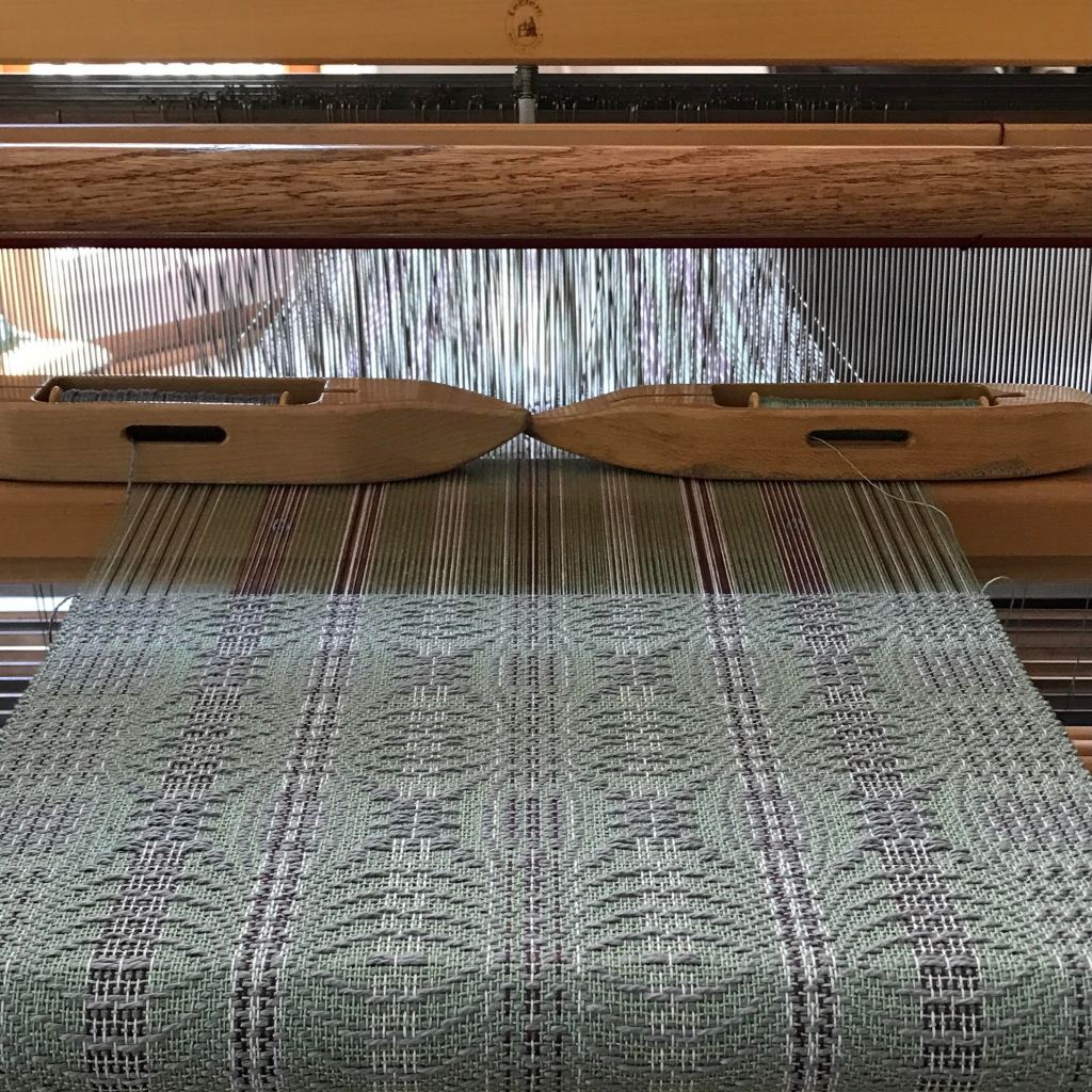 Here is a photo of the piece I’m working on at the floor loom, an overshot weaving featuring a polychrome warp: