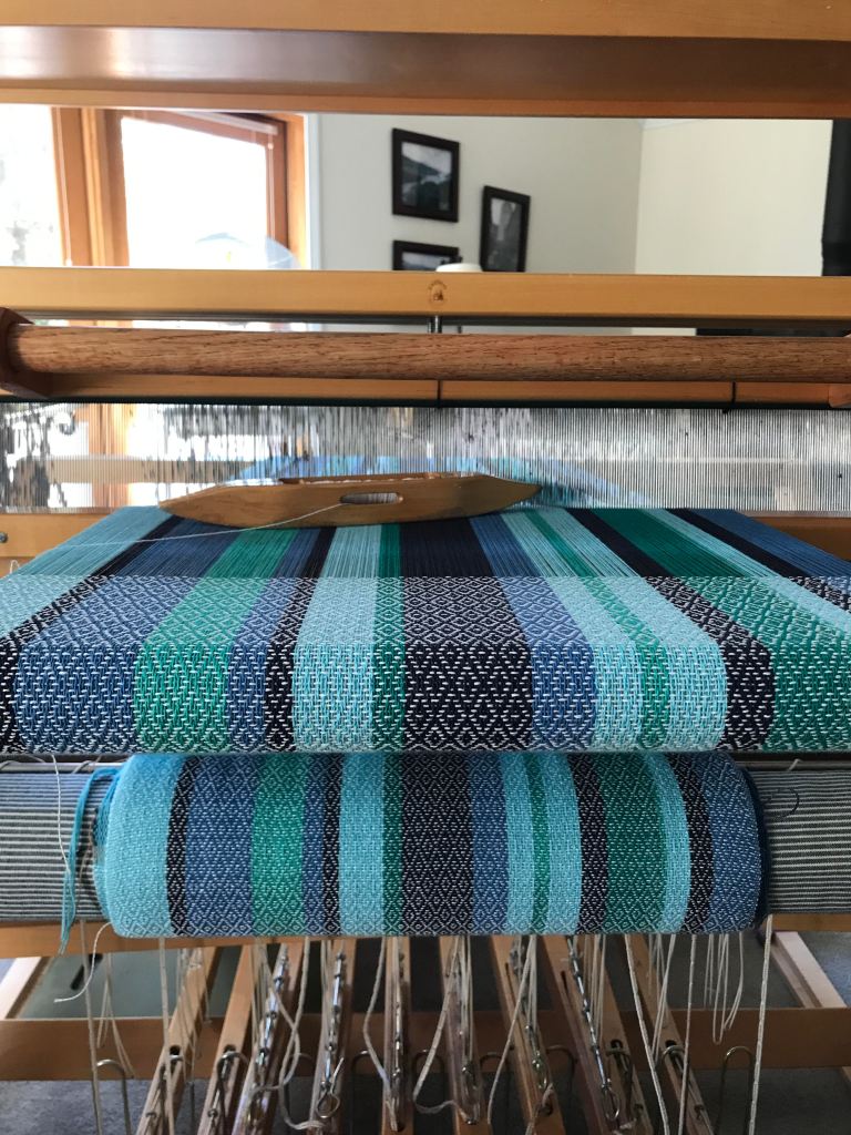 My loom has been populated with various kitchen towel warps for the entire month of October in order to fulfill gallery requests for holiday inventory and and for friends’ gift giving intentions. After some 50 yards of weaving the same pattern (I did change colors in the warps, which helped a little bit), some of the magic really started to wear off. It is a nice pattern, and one I enjoy weaving, but too much of anything can get tedious. It was a bit of a struggle to finish weaving the last 5 yards of fabric. (Actually, it was a SIGNIFICANT struggle).