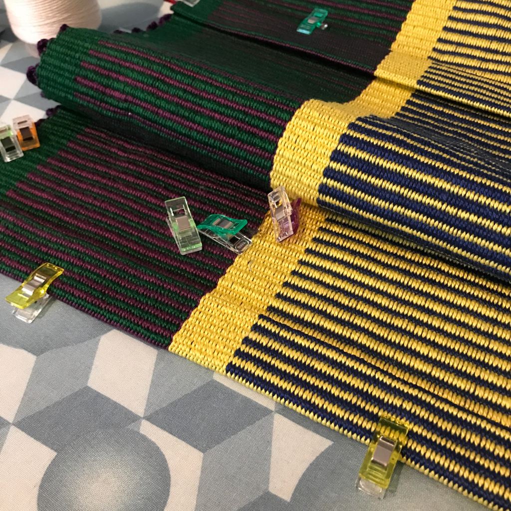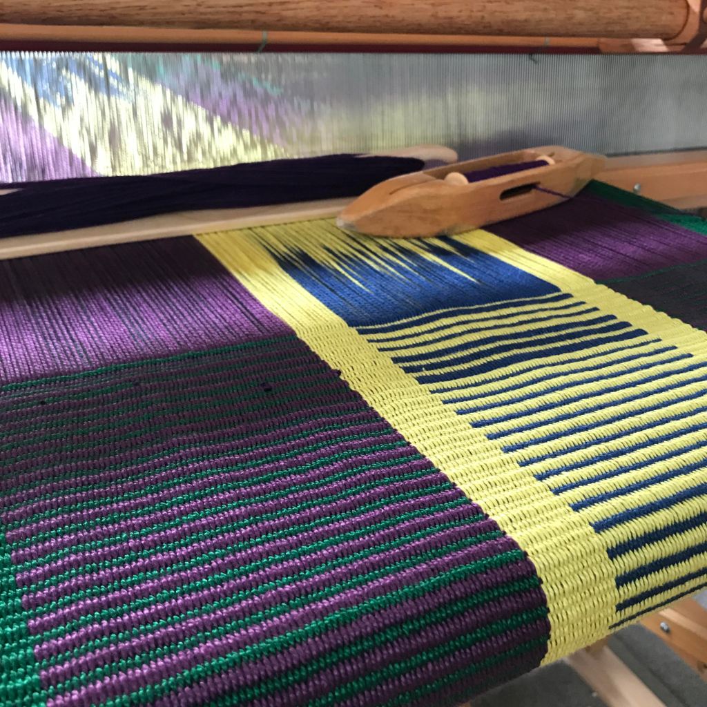 The warp was an assortment of 3/2 mercerized cotton yarns sett at 30 ends per inch. I had these yarns in my stash. I did not have enough mop cotton from my previous project to use this as the thick weft and so substituted four strands of 3/2 mercerized cotton held together.