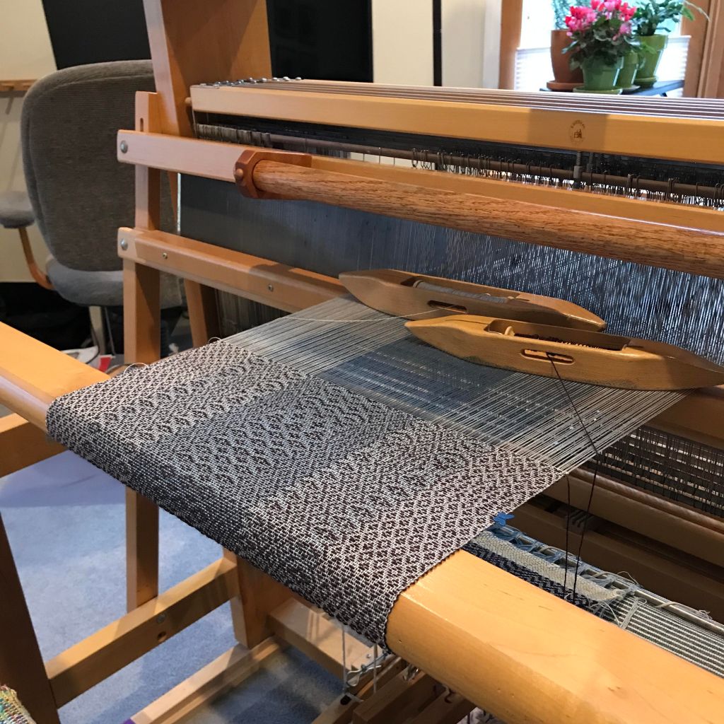 I tinkered a bit with a self-drafted overshot pattern. I am interested in seeing how this weaving structure adapts to a wearable piece instead of a sturdy household textile. The curved shapes that can be had with an overshot weaving technique seem like they may lend themselves to a shawl or scarf. Since a wearable wrap needs to have drape and, at least for me, not feel like a millstone around the neck, I experimented this week with a slightly looser sett for the warp of 10/2 mercerized cotton and a very lightweight alpaca/silk yarn for the pattern weft. The weave is definitely more “open” while on the loom; I’m hoping that a good wash will bring the threads together.