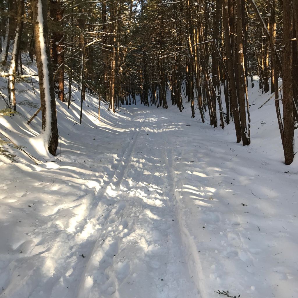 Next on the loom will be another overshot pattern, a colorful variation of Marguerite Porter Davison’s “Snowballs” design. The latest round of severe winter weather prompted me to pull out cones of spring green, lavender, and pink from my shelves. It’ll be good to shake out a bit of Spring onto the loom, even though Punxsutawney Phil reports that we will have six more weeks of winter. Bring it on, I say, if this is the case. I’d like to get on my cross-country skis a few more times anyway. I ski locally, either around our own property or on the rail trail not far from here. Isn’t it pretty?