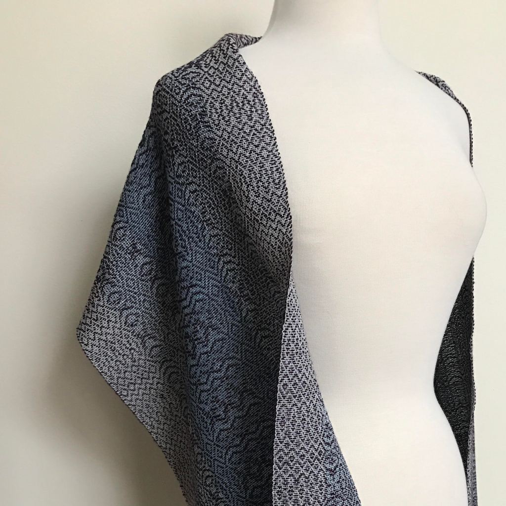 Hello, friends. I’m continuing my exploration (and enjoyment!) of colorful warps and overshot this month. The shawl that I worked on since writing my last post is finished and I’m pleased with the result. The piece has a has a nice drape. Here is a photo: