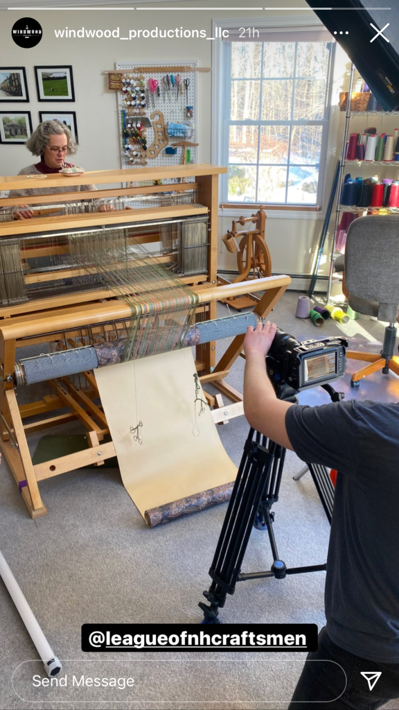 The springtime warp was on the loom when I had the good fortune to host Windwood Productions LLC and the League of NH Craftsmen at my home last week. I was interviewed in my workshop as part of a New Hampshire Council for the Humanities educational initiative called “Craft Stories.” The people from Windwood Productions were great. I was a bit of a nervous Nellie but the Windwood staff were very good at assuaging my concerns and helped me to feel right at home (even though I was in my own home). Here are a couple of pictures from the day: