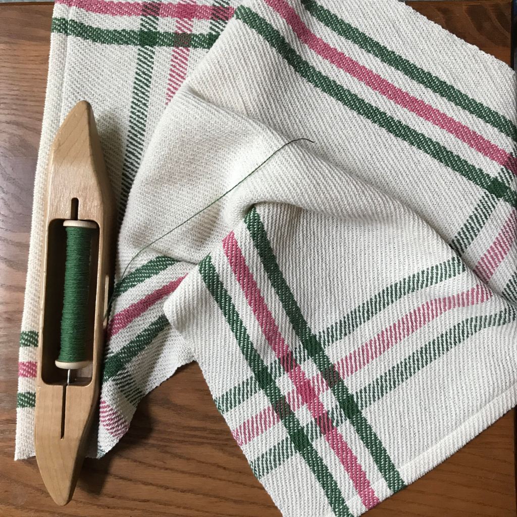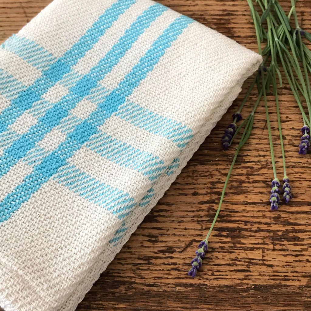 Hello, friends. I’ve been weaving kitchen towels for over twenty years and finally put together instructions for one of them. This design can be reworked just by changing the color scheme and the weaving is easy. I think it is a great way for newer weavers with four shaft looms to explore twill and to familiarize themselves with managing a warp with a lot of threads. Here is a photo of the finished towel: