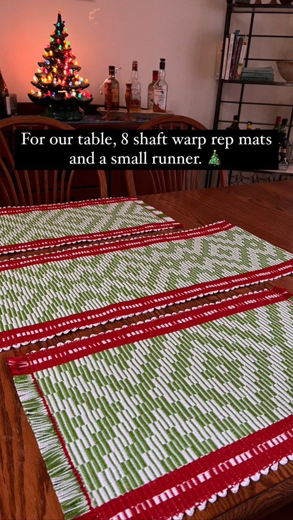 I prefer the clove hitch knot over hemstitching when I am interested in having a fringe on a warp rep piece; the warp is so dense (often 30 ends per inch or more) that sewing through all of those threads is a bit of a headache. The clove hitch knot, because it is separate from the weft yarn in the weaving, allows you to exercise some creativity when it comes to color, too. Here is an example of a row of clove hitch knots in bright red for my holiday placemats: