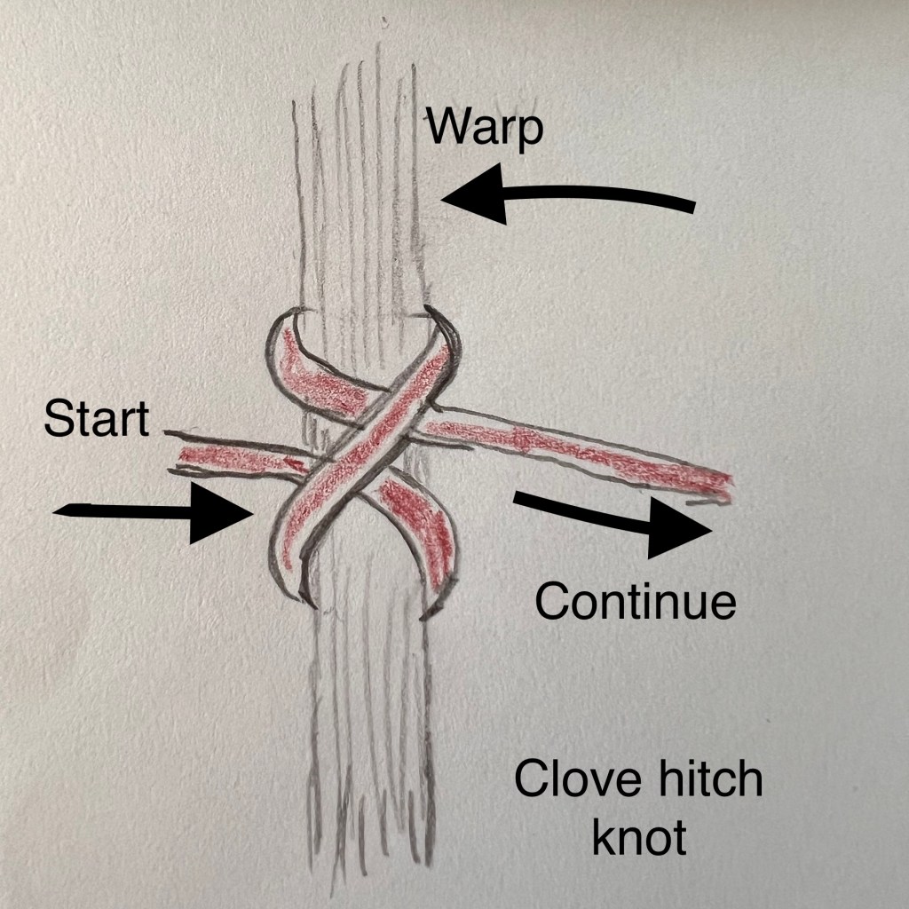 The clove hitch knot is not just for Boy Scouts and rock climbers. This knot is very useful for weavers. There are many illustrations that show one how to tie this knot; some can be found online and there are many guidebooks about knot tying. YouTube has several good videos describing the uses for this knot and how to tie it, but most are geared toward outdoor enthusiasts. Here’s an explanation that I hope is useful for my fellow fiber artisans.