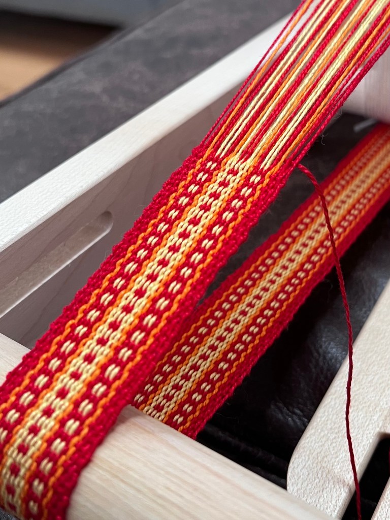 This fob is about 1.25″ wide and the band, which was woven on the inkle loom, is about 1″ wide. I stitched the band onto some sturdy cotton webbing; I thought it would give more “oomph” to the item. Speaking of inkle weaving, here is what is on the loom today: