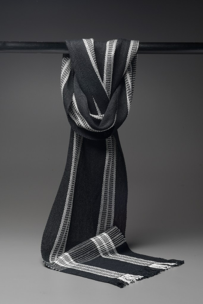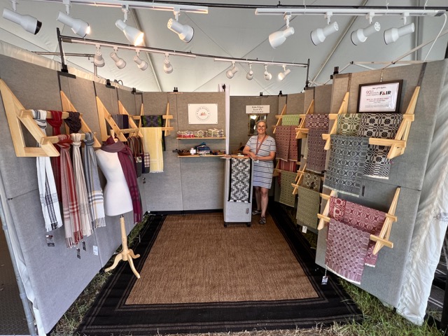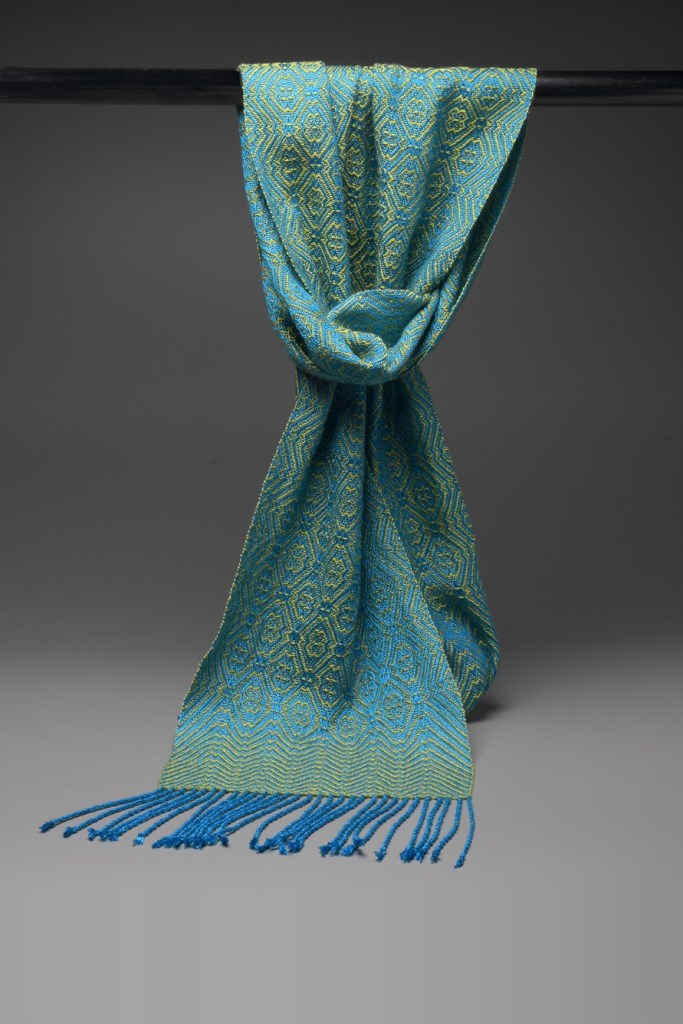 I am already back at the loom and looking forward to next year. I plan to weave more colorful scarves and shawls and have made several hefty yarn purchases toward this end. Here are a some photos, taken by photographer Charley Freiburg, of scarves from this year’s show: