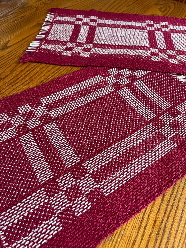Here are some new placemats that I plan to offer at the League of NH Craftsmen Annual Fair in August, 2025. Each mat is woven from mercerized cottons, is reversible, and is machine washable. My first run of these mats is woven in burgundy and ivory: