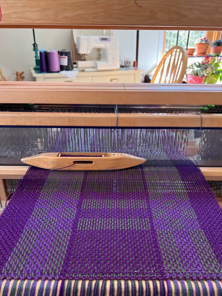 The purple mats actually have four different colored yarns in them : can you find them all? My husband asked if I plan to offer a print-at-home pattern of this design. I hadn’t really considered it, but perhaps it would be of interest to fellow weavers. It is a 4 harness design and uses just 1 shuttle. Let me know in the comments section if you’d be interested in weaving some of these mats for yourself.